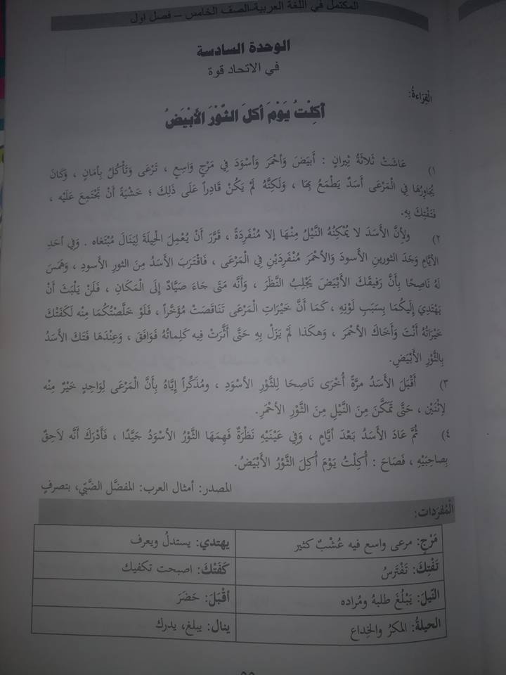 شرح و اجابات درس اكلت يوم اكل الثور الابيض لمادة اللغة العربية الوحدة الخامسة الصف الخامس الفصل الاول منتديات صقر الجنوب
