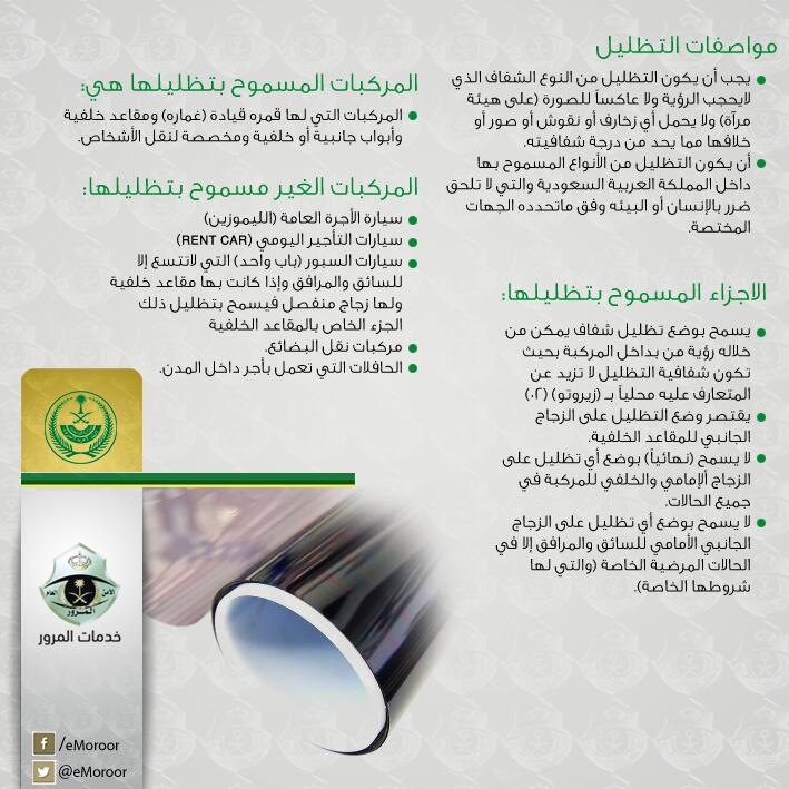 قامت الإدارة العامة للمرور في المملكة العربية للسعودية بتصميم إنفوجرافيك يوضح أماكن التظليل المسموح به للمركبات ومواصفات التظليل التي يجب أن تلتزم بها المركبات بالإضافة إلى نوع.