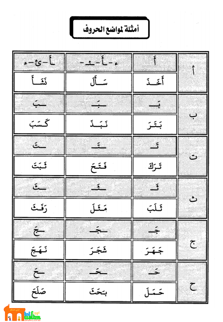 الحروف العربية الهجائية الحرف في أول الكلمة وسط الكلمة و آخر الكلمة موقع مدرستي