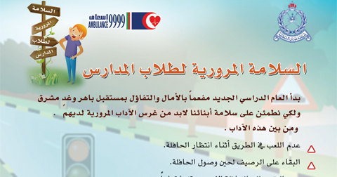 السلامة المرورية لطلاب المدارس. ارشادات مرورية لطلاب المدارس. اشتملت أهداف مذكرة التعاون الموقعة بين المرور والتعليم على 8 أهداف ممثلة في تعزيز قيم القيادة السليمة وتحسين مستوى السلامة المرورية لطلاب المدارس وتعديل سلوك مرتكبي المخالفات المرورية وتنفيذ برامج توعوية وتثقيفية وتهيئة الأماكن الخاصة لإلقاء المحاضرات وتنسيق زيارات لمصابي الحوادث المرورية وتقديم النصائح والإرشادات لمنسوبي التعليم والاستفادة من مصابي الحوادث الذين يمتلكون مهارات لتقديم النصائح. موضوع عن السلامة المرورية لطلبة المدارس. المدارس يمكنها بسهولة إنجاز توصيل وترسيخ مفهوم السلامة المرورية إلي الطلاب في دقائق فهي تفعل ببساطة أشياء لا يمكن لمؤسسات كبير في الدول أن تقوم بها ويأتي دور المدرسة في توعية الطلاب الصغار والكبار بأهمية بإتباع.
