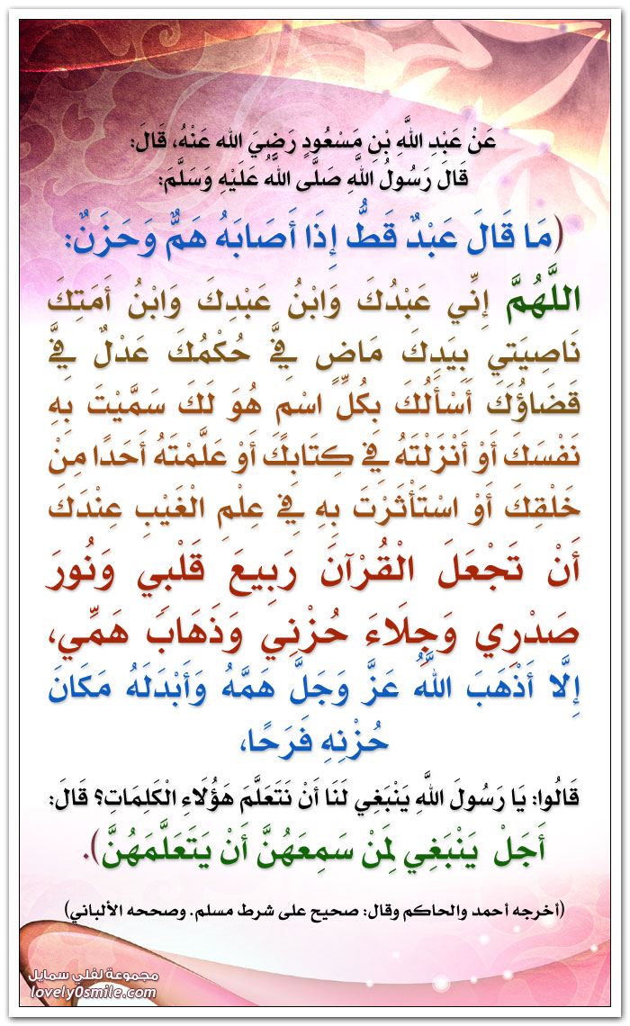شرح دعاء الهم و الحزن. ما أصاب أحد ا قط هم ولا ح ز ن فقال اللهم إني عبد ك ابن عبد ك ابن أم ت ك ناصي تي بيد ك ماض في. في المقدمة قلت لكم بان الدعاء يستجاب عند الله سبحانه وتعالى وان الاجابة تكون على ثلاث اوجه الان في هذه الفقرة سوف افصل لكم في هذه الاوجه الثلاثة التي تكون الاجابة على شاكلتها. سعيد بدوي learn smart.