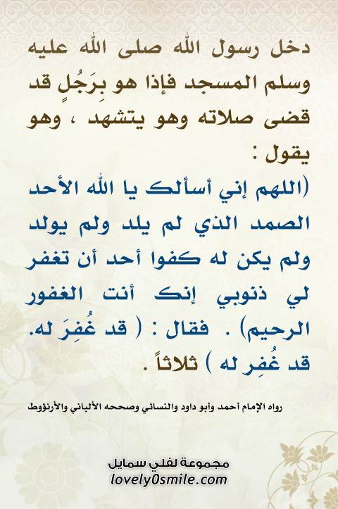 اللهم إني أسألك يا الله الأحد الصمد الذي لم يلد ولم يولد ولم يكن له كفوا أحد أن تغفر لي لفلي سمايل