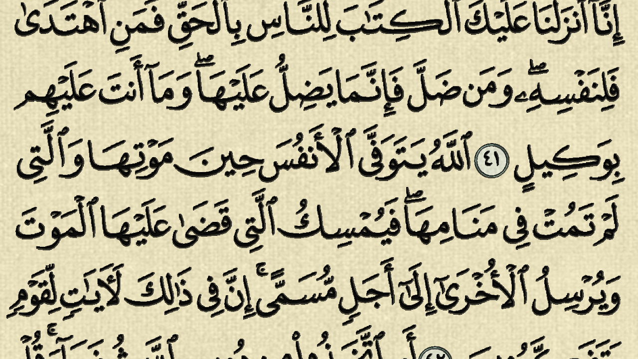القران الكريم الل ه ي ت و ف ى ال أ ن ف س ح ين م و ت ه ا و ال ت ي ل م ت م ت ف ي م ن ام ه ا ف ي م س ك ال ت ي ق ض ى ع ل ي ه ا ال م و ت و ي ر س ل ال أ خ ر ى إ ل ى أ ج ل م س م ى إ ن ف ي ذ ل ك ل آي ات ل ق و م ي ت ف ك ر ون