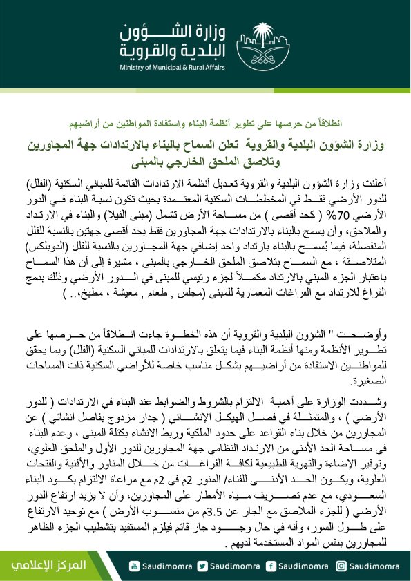 أعلنت وزارة الشؤون البلدية والقروية تعديل أنظمة الارتدادات القائمة للمباني السكنية الفلل للدور الأرضي فقط في المخططات السكنية المعتمدة بحيث تكون نسبة البناء في الدور الأرضي 70 كحد أقصى من مساحة الأرض تشمل مبنى.