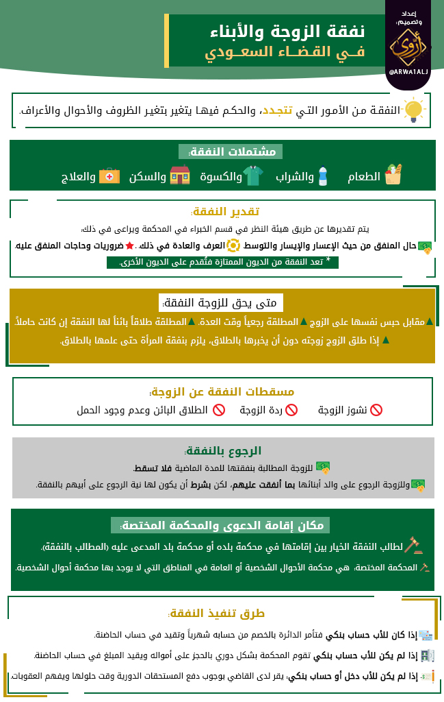 النفقه في القانون السعودي. القانون الذي يخص الأطفال الصغار هو أن الطفل الذي لا يمتلك مال فإن نفقته تكون على أبيه وتستمر نفقة الأطفال حتى تتزوج الفتاة أو أنها تحصل على ما يكفيها من النفقة وفي حالة الأولاد أن يصل إلى 15 عام أو أن يصل الطفل إلى العمر الذي يؤهله الصرف على نفسه وفي حالة أن كان الطفل غير قادر على الصرف على نفسه لسبب ما علي أبيه أن يستمر في الإنفاق عليه كما أن الأب يظل ملتزم بالإنفاق على الأولاد والعمل على توفير المسكن المناسب لهم وأن يكفل لهم العيش في المستوى المناسب لهم. منحت اللائحة التنفيذية لنظام التنفيذ في قضايا النفقة الأولوية في الحجز على راتب الزوج للمرأة الصادر بحقها حكم نفقة. إن أبغض الحلال إلى الله الطلاق كما جاء ذكر الطلاق أيضا في القرآن الكريم حيث. السعودي على كل من يماطل في دفع النفقة فإن القانون ينص على أنه يتم معاقبته بالسجن لمدة لا تزيد عن سبع سنوات.