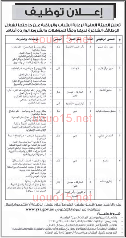 تعتبر الهيئة العامة لرعاية الشباب والرياضة السلطة الحكومية العليا المختصة برعاية قطاع الشباب والرياضة والعناية بشؤونهم ونشاطاتهم في دولة الإمارات العربية المتحدة. الهيئة العامة لرعاية الشباب والرياضة تفتح باب التسجيل في برنامج ذخر عاجل أبو بكر. حملة دولية للضغط على الاحتلال للإفراج عن الأسرى المرضى في ظل كورونا. وزير الدولة لشئون الشباب.